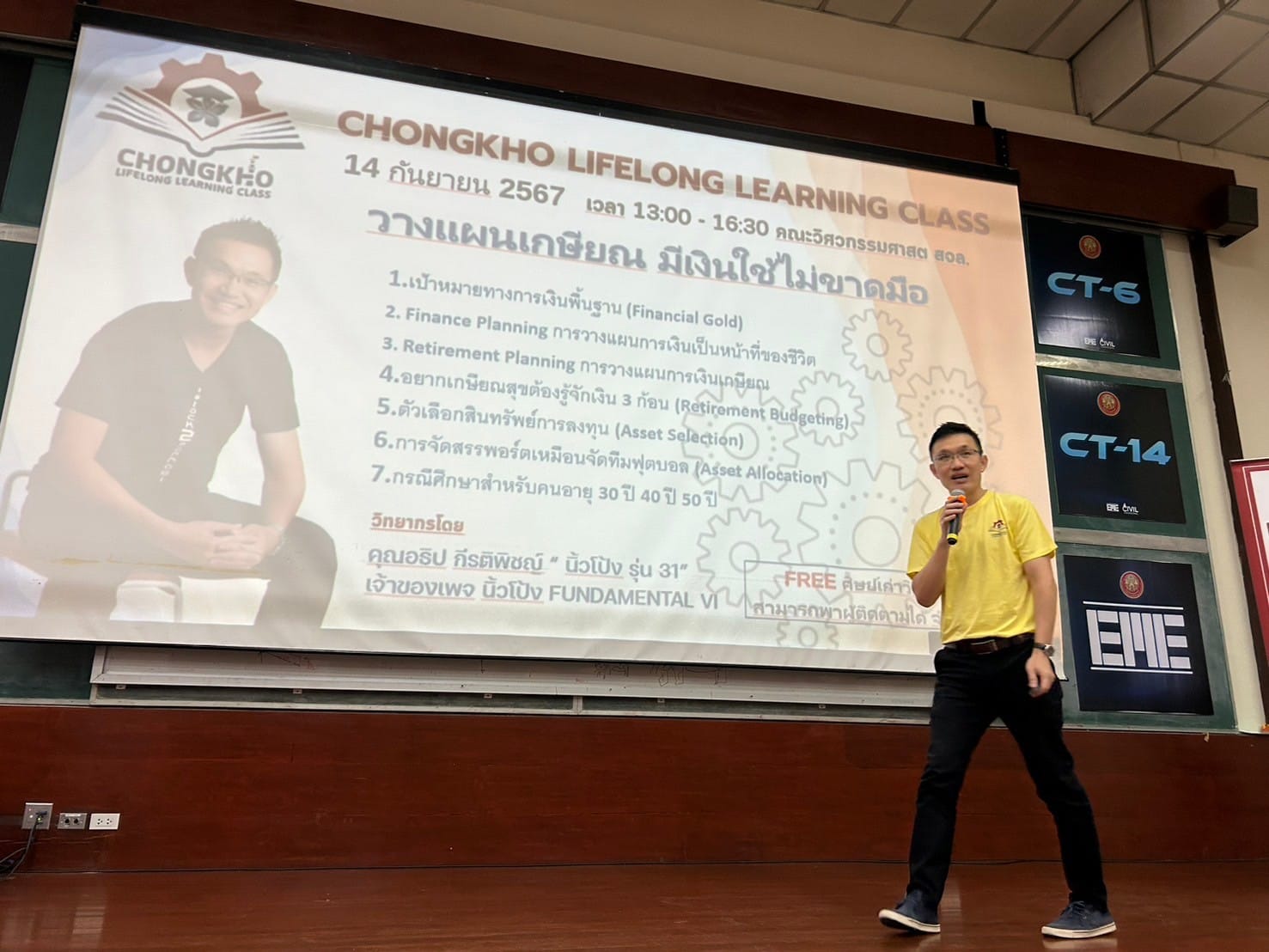 หัวข้อ “ การวางแผนเกษียณ มีเงินใช้ไม่ขาดมือ” วิทยากรโดย คุณอธิป กีรติพิชญ์ หรือพี่โป้ง รุ่น 31 เจ้าของเพจ Facebook นิ้วโป้ง Fundamental VI